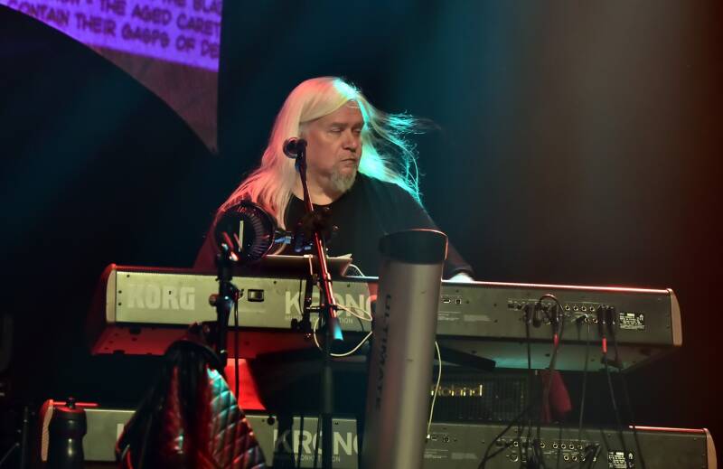 The beginning was impressive and Damian Wilson showed from the first note why he is so acclaimed. What a super throat that man has, and just as good live as on record. As expected they began with Time Capsule and what a start that was.The sound wasn't quite right at the beginning, Clive Nolan's keys were hard to hear and the bass pedals didn't have the impact you want to hear yet. However, this was quickly adjusted and there is also a big compliment to be handed out, the volume was perfect. Hard enough to feel it in your stomach but not disturbing to your ears. Very important because that is certainly not always the case. I shall not mention all of the songs they played and I surely missed a few but when they played The Visitor and The Butterfly Man Damian proved that these songs can even sound better.